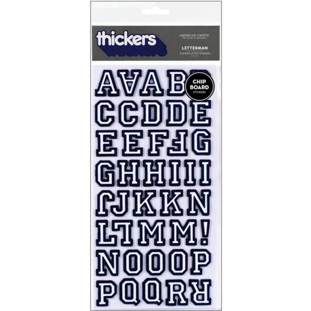 American Crafts - Thickers Flocked Chipboard Stickers 6"X11" Sheets 2/Pkg. Add some fuzzy dimension to any project with these flocked chipboard stickers! Each sticker measures 1-1/8 inch tall and uppercase letters, numbers, and punctuation marks are all included. This package contains two 11x 5-1/2 inch sheets of stickers.Acid free, archival quality.